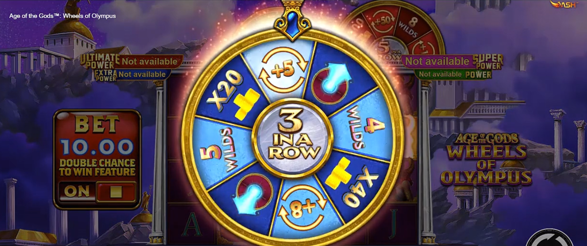 To boost your chances of triggering the Wheels of Olympus, activate the feature bet to the left of the grid. Remember that even while your total stake will go up, the values listed on the Age of the Gods Wheels of Olympus slot machine pay table won't.